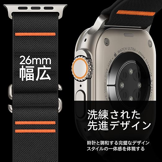 【洗練されたデザイン】職人技を込めて、丁寧に作り上げた26mm幅広のApple Watchバンド。外観のアクセントとなるオレンジのラインは、配色と個性を際立たせ