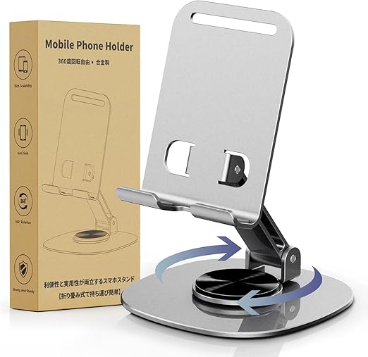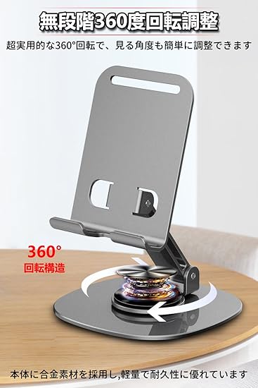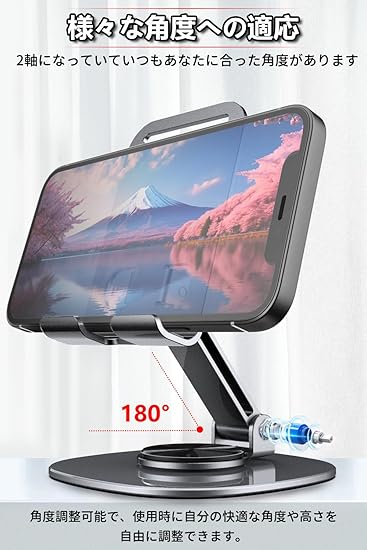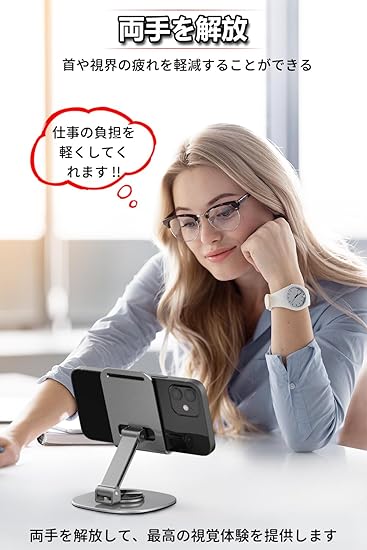 【360度回転可能】スマホスタンド台座が360度回転するため、スマートフォンやアイフォンを載せたまま、見せたい向きに自由に回転させることができます。カチカチと軽めのいい音が出ながら回転してかなり高級感があります。縦向きでも横向きでも、 ブラウジング、読書、ゲームに最適な角度を見つけて、負担のない体験をお楽しみください。