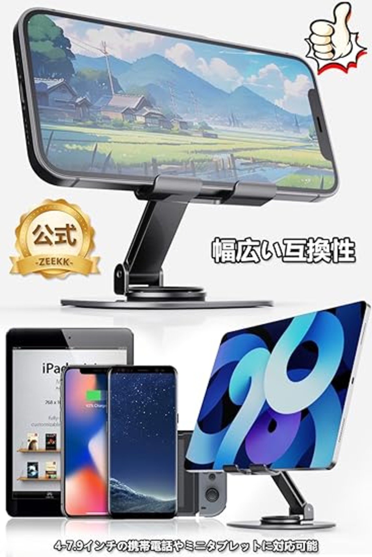 ZEEKK【全金属素材】スマホスタンド 卓上「極上の新設計」合金製 360度回転 折りたたみ式 携帯スタンド 薄型 携帯に便利 縦 横 滑り止め 4.7-6.8インチのiPhone Android 対応 a
