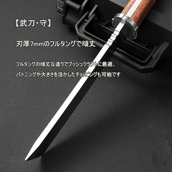 【武刀・守】【刃材】7Cr17MoVステンレス鋼 【刃処理】線引き仕上げ 【硬度】58HRC 【ハンドル材質】ベトナム産カリン材 【全長】385mm 【刃渡り】145mm 【刃厚】7mm 【刃幅】36mm 【柄丈】165mm 【柄幅】26mm 【重量】590g 【鞘材】革製 【鞘丈】363mm 【鞘幅】58mm 【鞘重量】113g ※サイズ表記(刃部分実測)については弊店までご連絡をお願いします