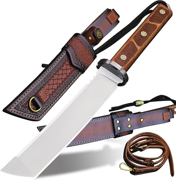 鞘付和式アウトドアナイフ 7Cr17MoVステンレス鋼 【武刀・守】 桜紋三本鋲本通り飾りベトナム産カリンの柄 専用手作り革製鞘+ショルダーベルト付 刃厚7mmのフルタング構造 a