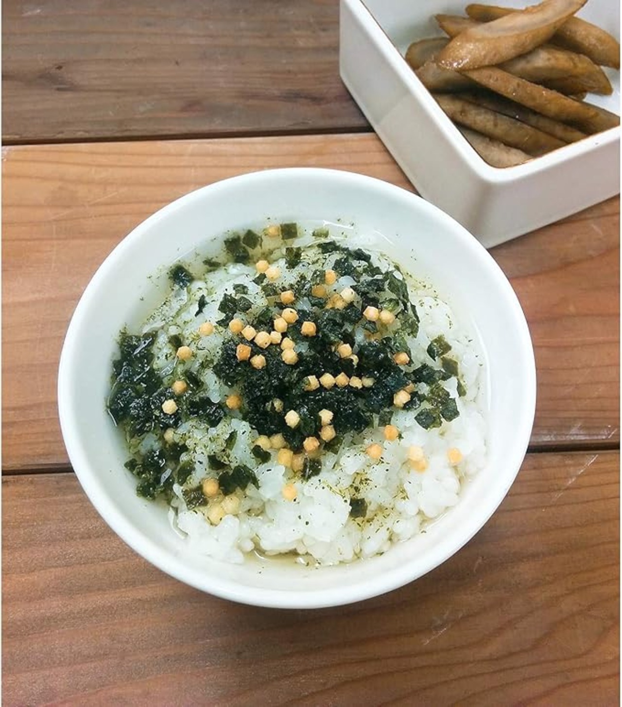 原材料:食塩、あられ、小麦発酵調味料、デキストリン、粉茶(緑茶)、のり、椎茸エキスパウダー、粉末醤油、昆布パウダー、(一部に小麦、大豆を含む)