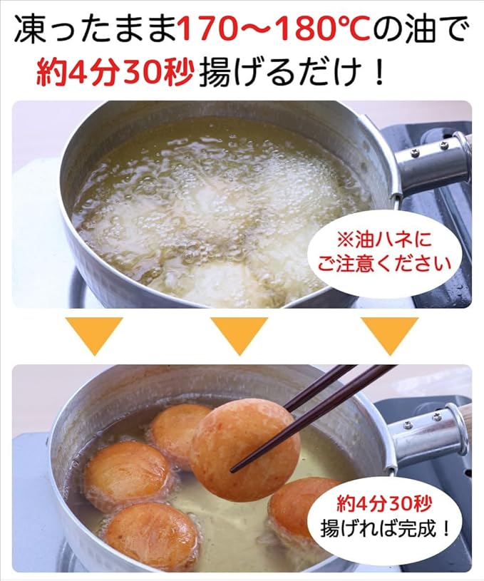 【調理方法】 冷凍のまま170~180℃の油で約4分30秒揚げてから召し上がりください。※調理時間は一度に調理する個数や機器等で調整してください。
