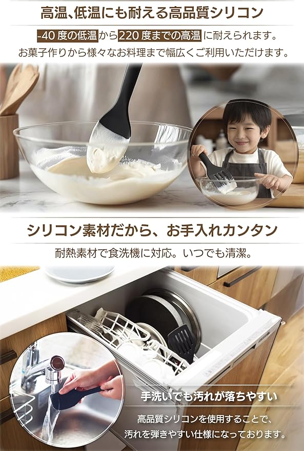 熱伝導しにくい、耐熱温度220℃まで変形しない。食器洗い乾燥機に対応可