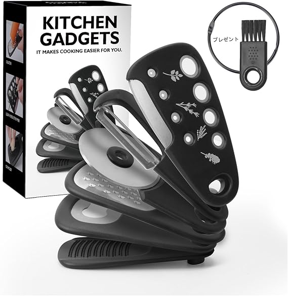 多機能な道具: おろし器、ピザカッター、栓抜き、ピーラー(皮むき器)、ハーブカッターなど、便利な道具がセットになっています。