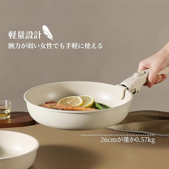 【快適な調理体験】内面がマーブルコートをしているため、くっつきにくくスムーズに調理できます。調理後もスポンジで軽く拭くだけで、汚れもスルッと落ちます