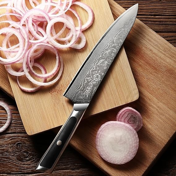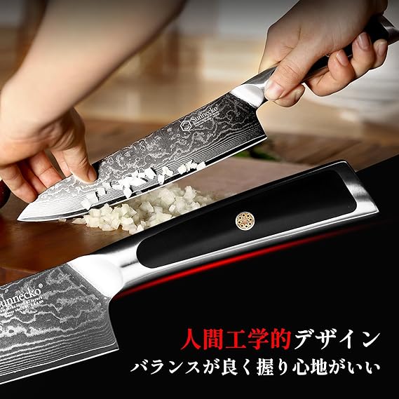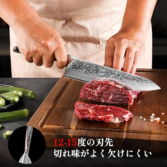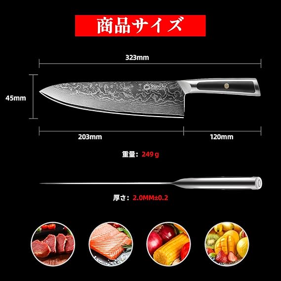 【切れ味抜群、多機能】最高級の芯材、高級刃物鋼のVG10を使用し、67層ステンレス鋼も重ね合わせ製作され、硬度HRC60±1で靭性・耐衝撃性、耐久性を兼ね備えたダマスカス鋼包丁です。わずか2mmの刃が薄くて鋭い、硬い鋼部が軟質部で包み込まれて曲がりにくく折れにくいです。普通の鋼よりもっと切れ味がいいです。この牛刀包丁は肉・野菜・魚などに使える万能包丁で、ご家庭用に最適な包丁です。ELITE-Aシリーズ世界通算販売数本数10万本突破!(※2025年2月時点)サイズ:全長:327MM、刃渡り:203