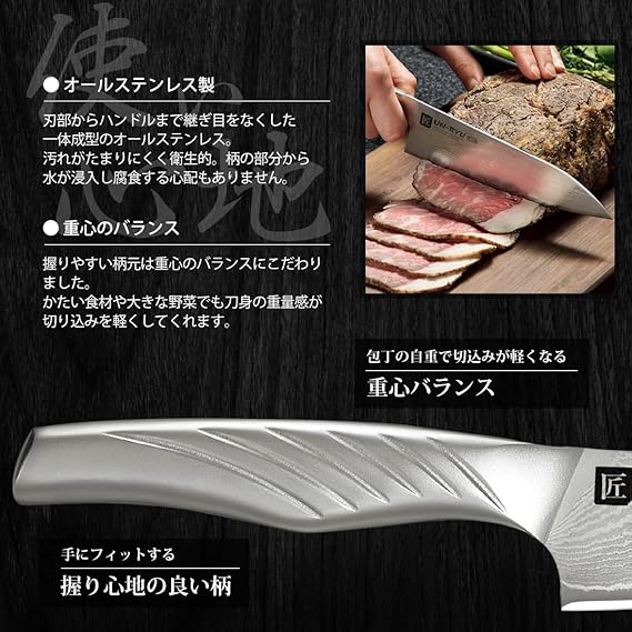 材質:刀身/VG10ダマスカス33層鋼(芯材/VG10、側材/ダマスカス33層鋼)、柄/18-8ステンレス
