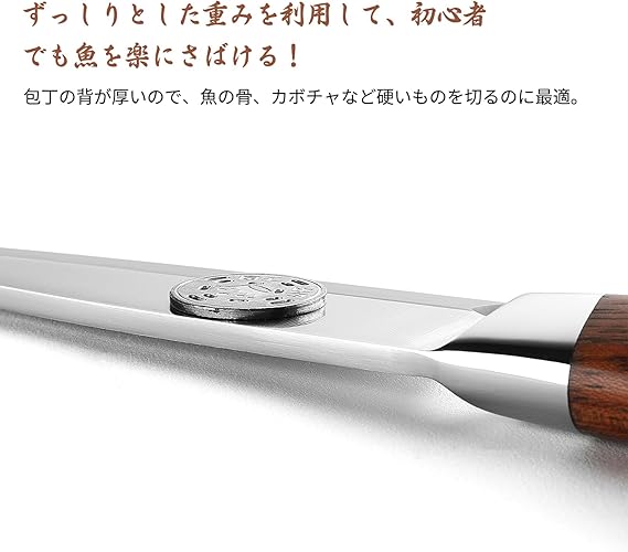 【鋭い切れ味】高炭素ドイツ1.4116ステンレスを採用しており、錆に強く、切れ味、耐用性、耐摩耗性が優れています。精鋼技術で作られているため、刃が硬く、磨耗しにくいのが特徴です。他の鋼より強く切れ味が長持ちします。ずっしりした重量感があり、重みを利用して魚や肉をさばくのに適した出刃包丁です。すり傷防止のために刃の表面はマット仕上げしております。研ぎなどメンテナンスをしっかり行え
