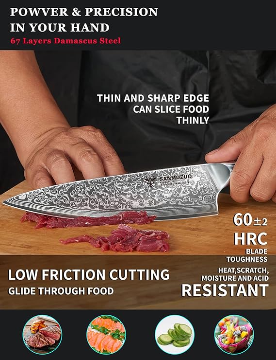 プレミアムブレード:これは三徳包丁タイプで、精密なアーチ型のブレードは67層のダマスカス鋼で作られており、コア層は10Cr15CoMoV素材で、両側に33層の高品質の高炭素ステンレス鋼層で包まれており、優れた強度、靭性、耐久性を確保しています。両面の研磨された表面とディンプルにより、抵抗を最小限に抑え、ゼリーのように滑らかなカットと強化されたノンスティック性能を実現できます