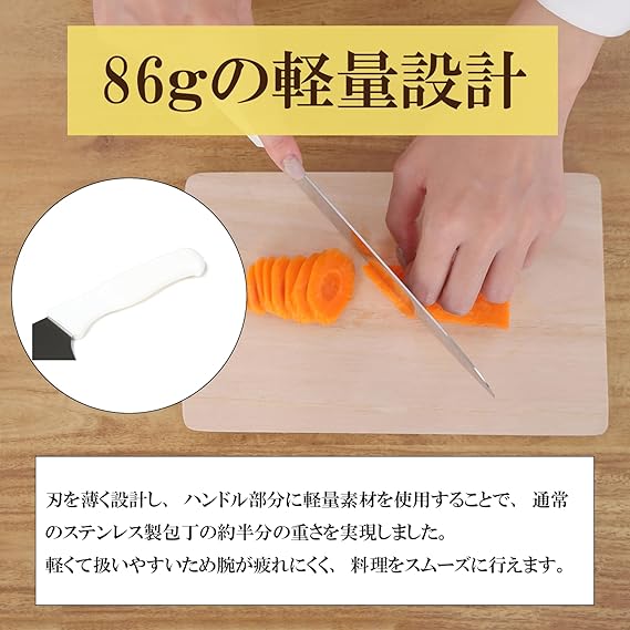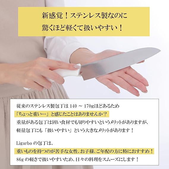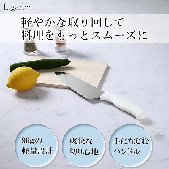 キッチンや包丁にこんな願望をお持ちではありませんか? スムーズに食材をカットしたい すっきり&おしゃれなキッチンにしたい ホワイトやブラックのシンプルなアイテムで統一したい Ligarboの包丁『スムーズリヘロ』にお任せください! これらにお応えして、軽くて扱いやすい、シンプルで洗練された包丁に仕上げました。