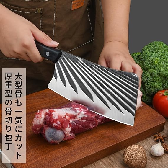 2✿(重型骨切り包丁)5.0mmの背厚と重量感を持つ骨切り包丁はラム、ビーフマロー、豚骨などの大骨と冷凍品を楽に叩き切ります。広い刃幅と重量感は大根、キャベツの千切り、大蒜の潰し、肉のみじん切りを簡単に実現します。板厚い刃背を利用し、豚肉と牛肉を叩き、弾力性出り、家庭でも美味しいステー