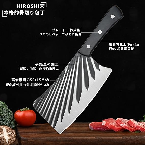 HIROSHI 厚重型の骨切り包丁 大型中華包丁 豚骨 牛骨切り専用 クレーバーナイフ チョッパーナイフ 板厚5.0mm 876g 厚刃 キッチンナイフ 黒打ち 錆びにくい 積層強化木 家庭用 肉屋用 a a