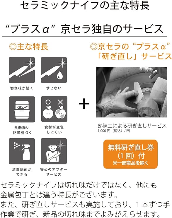 【長くお使いいただくために】セラミックスは金属ではございません。シンクに落としたり、切る時に横にこじるような動作は避けてください。また、かぼちゃ、冷凍食品 (半解凍食品) 、餅、骨付き肉および魚、カニ、とうもろこし、果実の種などの硬い食材には使用しないでください。刃が欠けたり、折れる場合があり
