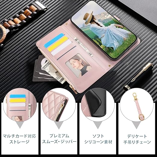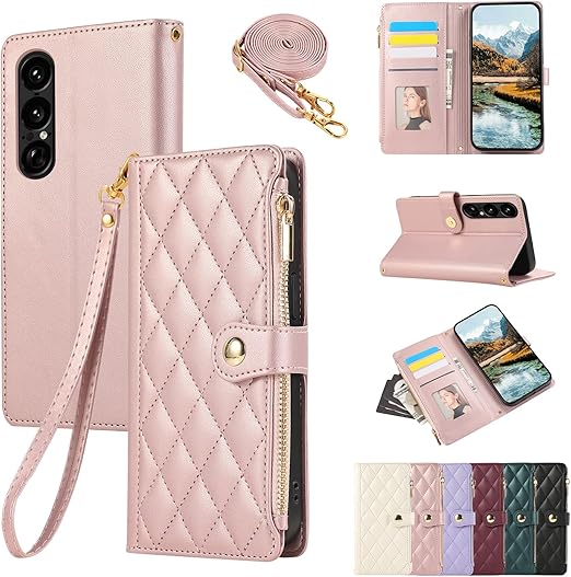 Yuotky Xperia 1 VII ケース 手帳型 エクスペリア1 VII ケース ショルダー SO-51F/SOG15 カバー ひし形柄 Xperia 1 VII スマホケース 人気 女性 エクスペリア 1 7 カバー 肩掛け カード収納 ジップ付き財布 横置き機能 シンプル お洒落 スマホケース (ローズピンク) a
