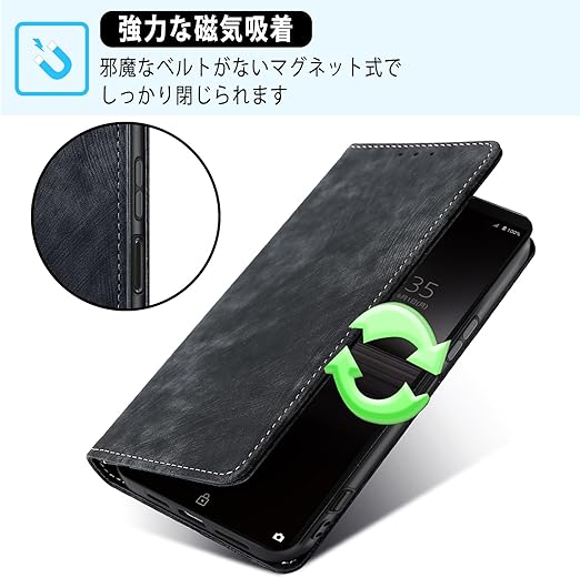 【素材】:NicMoolスマホケース手帳型外部は上質な合皮レザー素材を採用しており、傷や埃を防ぐことができます、滑りにくく、指紋、油分などもつきにくく。外部のPUレザー+内部の黒TPUという二重保護で、衝撃減少の機能性が抜群、スマホをしっかりと守