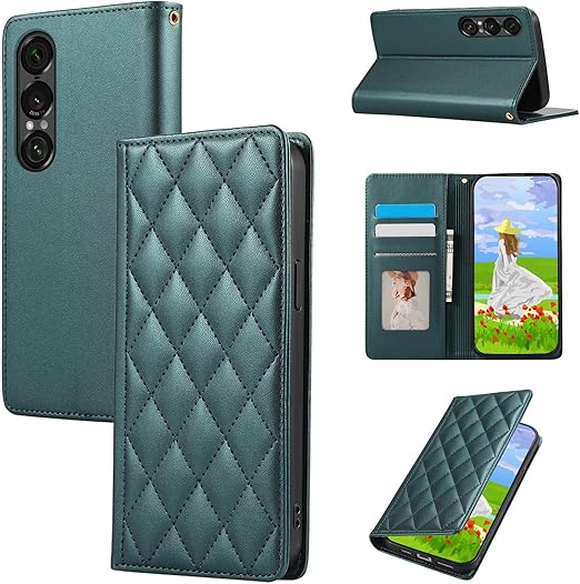 Gedurya Xperia 1 VII ケース 手帳型 SO-51F ケース 財布型 カード収納 RFIDブロッキング エクスペリア1 vii 手帳型ケース マグネット式 ダイヤモンド グリッド シェイプ Xperia1 VII スマホケース SOG15 カバー スタンド機能 携帯カバー - グリーン a