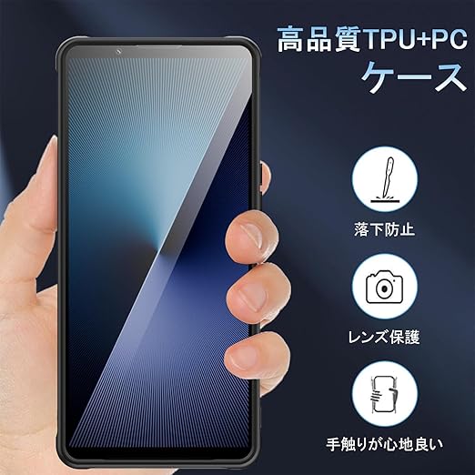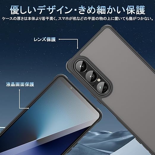 【レンズとスクリーン保護】ケースの厚さは本体より若干高く、xperia 1 viiが机などの平面の物の上に置いても傷がつかない。スマホが落下した際に液晶画面やレンズに傷が付かないようにする。
