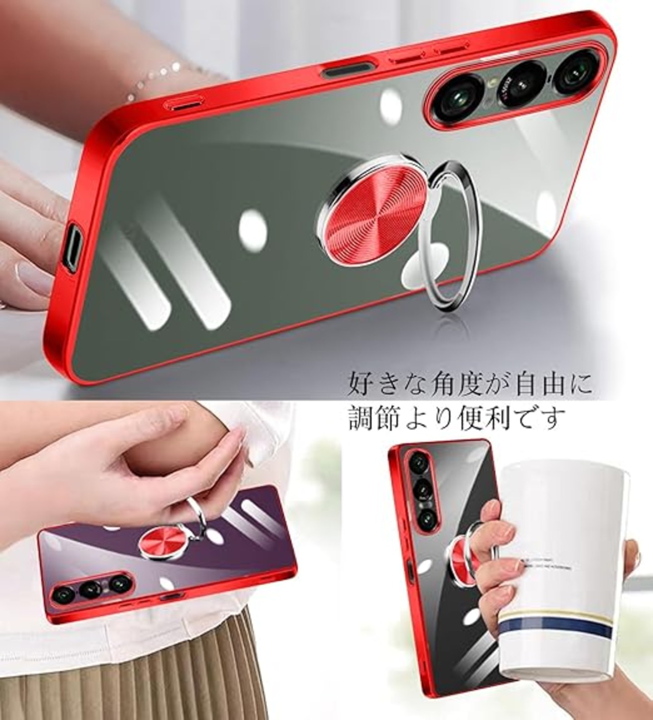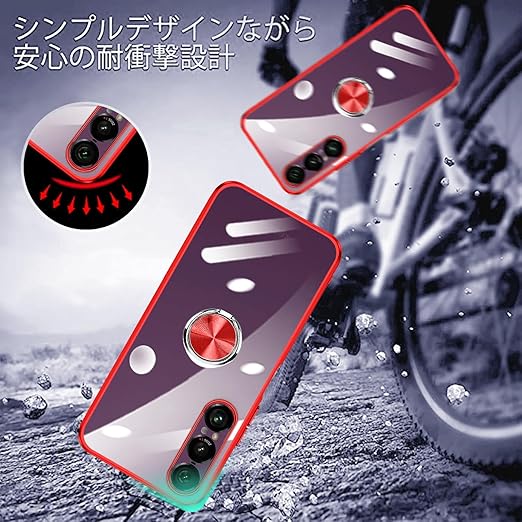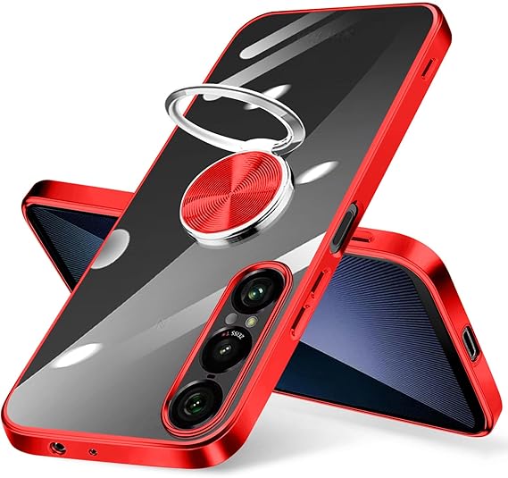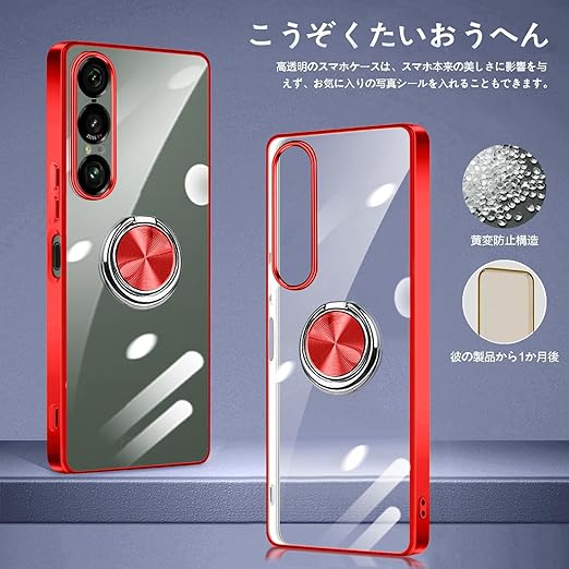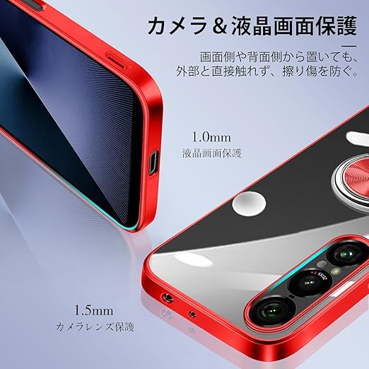 Xperia 1 VII ケース リング付き クリア xperia 1vii カバー ストラップホール付き 耐衝撃 全面保護 軽量 薄型 かわいい エクスペリア 1 vii スマホケース スタンド機能 車載ホルダー対応 擦り傷防止 滑り止め 落下防止 TPU 透明 (レッド) a