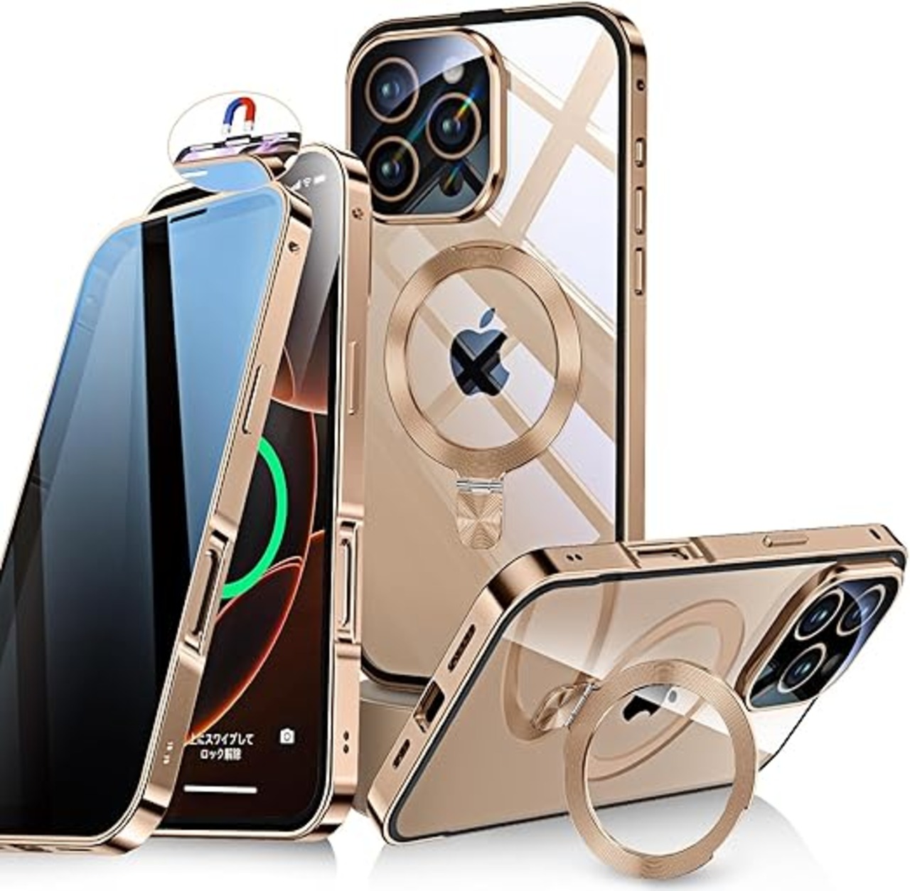 Bluoocase【磁石+溝二重自動ロック!3in1スタンド・覗き見防止】iPhone 16 Pro Max 用 ケース 全面保護 Magsafe対応・CDリング 縦横両立 アイフォン16プロマックス カバー 9H強化ガラス 両面 一体型レンズ保護 高感度タッチ ストラップホール付き 透明 PC背面 アルミバンパー いphone16promax 用 携帯ケース 6.9インチ(デザートチタニウム) a
