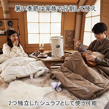 【分割しても使用可能シュラフ】2つ独立したシュラフとして使う可能、暑ければ減らして寒ければ増やす、暑い季節は家族で分割して使える、4シーズンで対応寝袋。裏にブランケット付属、ひざ掛けとしても使える。単一使用サイズ:幅90x長さ210cm、完全に開くとダブルサイズの掛け布団としても使える。幅広の封筒型で、良いストレッチ性も持ち、大柄な方でも圧迫感を感じせず、家にいてもキャンプ気分が味わえる。