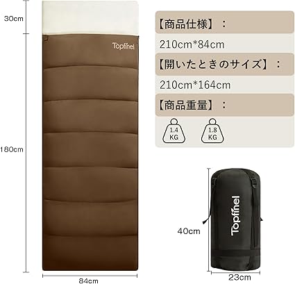 【基本情報】サイズ:縦(本体部約210cm)×横(幅約84cm)。重量:約1.4kg/1.8KG 最低使用温度:1.4KG 5℃ 1.8KG 1℃ 快適使用温度:1.4kg 11℃-17℃/1.8KG 6℃-12℃(自身の暑さと寒さの感覚によって使用)。