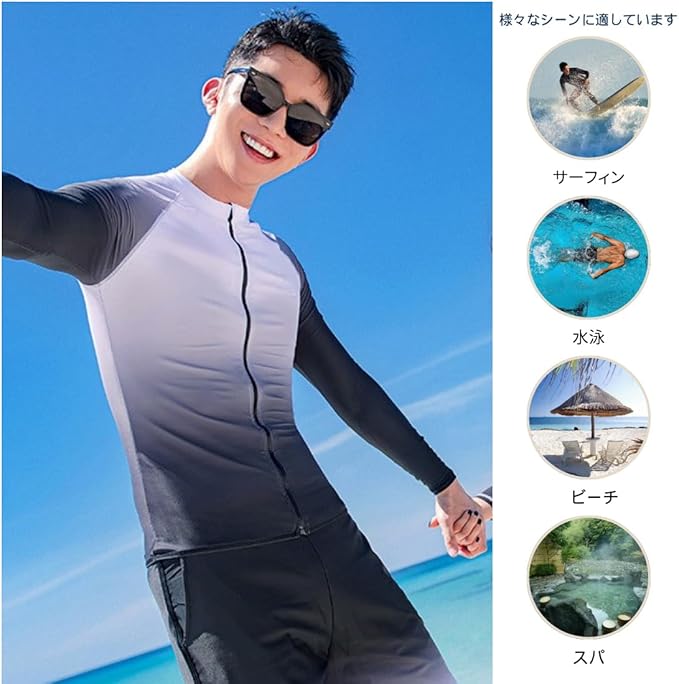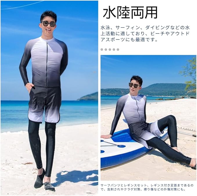 [wechose] ラッシュガード 水着 メンズ 上下セット フィットネス水着 3点セット ジップ アップ 長袖 前開き スイミング サーフパンツ レギンス ビーチ 水泳パンツ UVカット UPF50+ 温泉 競泳 通気性 水陸両用 吸汗速乾 d