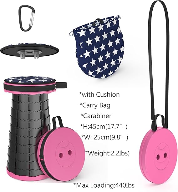 【高さ調節も自由自在折り畳みスツール 】 セット内容:折りたたみスツール本体x1、星柄収納バッグx1、360度回転クッション、カラビナx1 最新第5世代折りたたみ椅子、より軽量化、より頑丈、より高い耐久性!