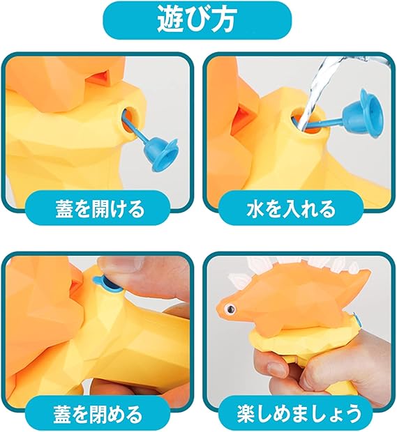 素材:プラスチック製の恐竜水鉄砲です。子どもに向けのため、丁寧に加工しており、バリがなくあんしんして遊ぶことができます。6歳以上
