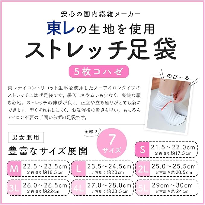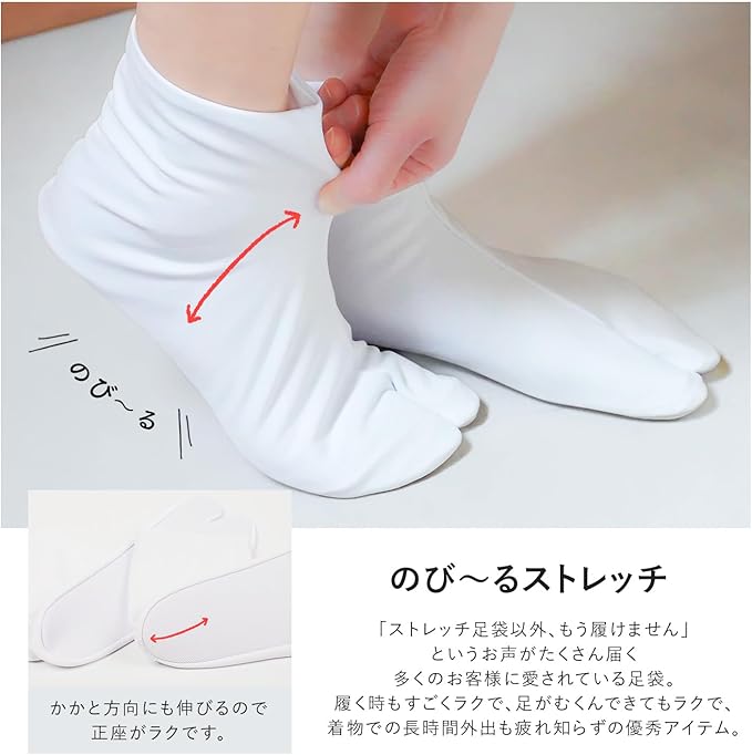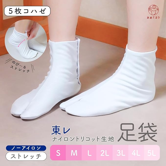 [あめてまり] 足袋 ストレッチたび 東レ 1足 こはぜ付 5枚コハゼ のび~る らくらく ノーアイロン 着脱簡単 白 無地 男女兼用 レディース メンズ クッション底 ナイロントリコット生地 和装 着物全般対応 通年用 外反母趾対応 足に沿う 洗える 常用品 a