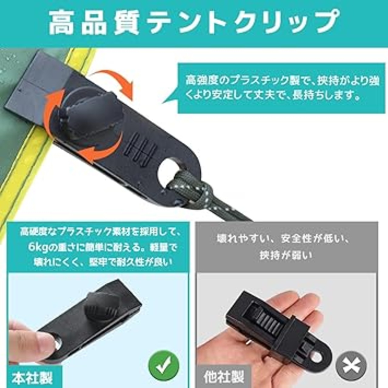 【テントクリップ】高強度、高硬度なプラスチック素材を採用して作り、防水性、耐寒性、耐食性に優れて丈夫で長持ちです。手のひらサイズで軽量なデザインで、持ち運びと収納しやすいです。耐荷重は約6Kgまでで、大きな力で引っ張ってもなかなか外れません。