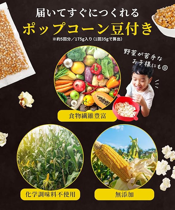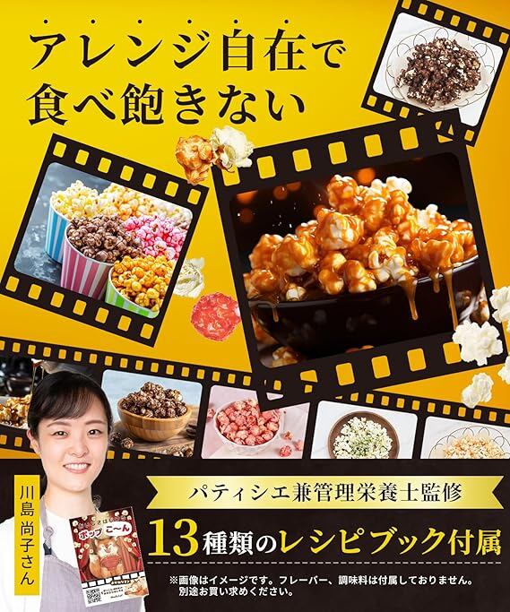 【約5回分のポップコーン豆がセットに!】ポップコーン豆、ポップコーンメーカー、パティシエ監修レシピブックがセットになっており、届いてすぐに作れます。(1セット175g入り/1回35gで算出)
