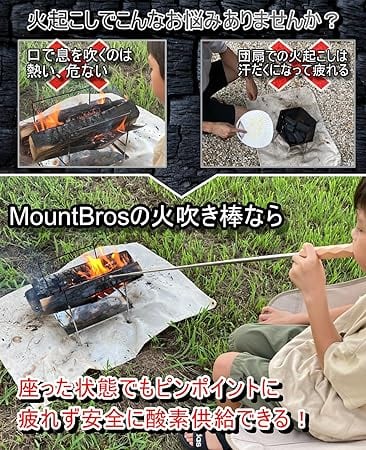 【キャンプのプロが推薦】MountBrosから火吹き棒が販売開始しました。「日本キャンプ協会公認インストラクター」、「JBS認定ブッシュクラフトインストラクター」2つの資格を保有しているプロキャンパーに推薦していただきました。キャンプやバーベキューの火起こしの際にうちわのように疲れることなく、ピンポイントに効率的に酸素を供給できる必須のキャンプ用品です。