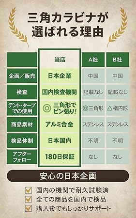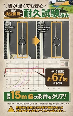 【 頼れる カラビナ 】 国内耐久試験を行った67kgの力に耐えられる設計。アルミ合金製なので強風が吹いても安心です。