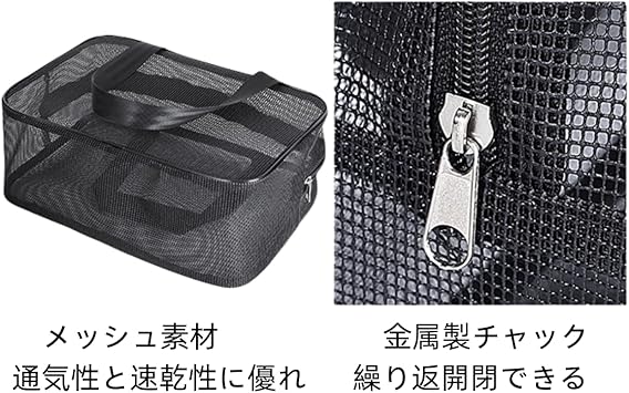 速乾性:速乾性に優れたメッシュ素材で、お手入れも簡単です。水洗いして干すだけ。もうカビたり臭ったりするシャワーバッグは必要ありません
