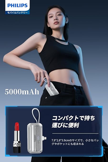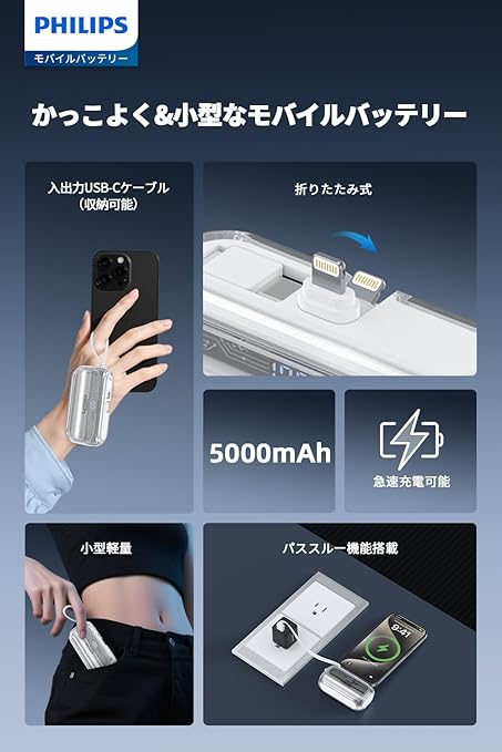 Philips (フィリップス) モバイルバッテリー 5000mAh 小型 Lightningコネクター USB-Cケーブル 内蔵軽量 大容量 二台同時充電 モバイル充電器 パススルー機能 PSE認証済 lightning&usb-c デバイス対応 DLP2568VW a