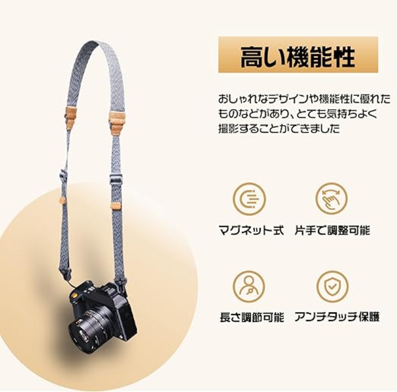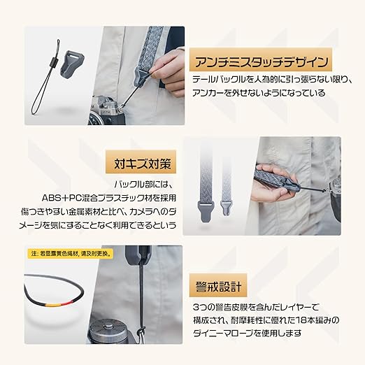【長さ調節可能】このショルダーストラップは、速写ストラップにもなっています。ストラップには留め具が付いており、長さの調節が素早くできます。撮影しないときはストラップを締めることでカメラを体に密着させることができるので、カメラがブラブラせず移動がしやすい