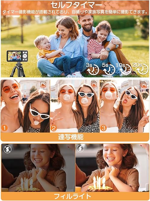 【4K&6400万画素&タイムプラス録画機能】ハイビジョンプロセッサーを内蔵し、美しくクリアな写真を撮影できるデジタルカメラは、4K動画撮影や1080Pのビデオ解像度、さらに6400万画素の写真解像度を提供します。素晴らしい瞬間を簡単にキャプチャでき、記録カメラとしても、Vloggingカメラとしても最適です。ご家族やお友達との楽しい瞬間を鮮明に捉え、美しい思い出をいつでも記録できます。また、タイムラプス録画機能も搭載しており、これは一定の時間間隔で連続的に撮影した静止画をつなげて、時間の流れを