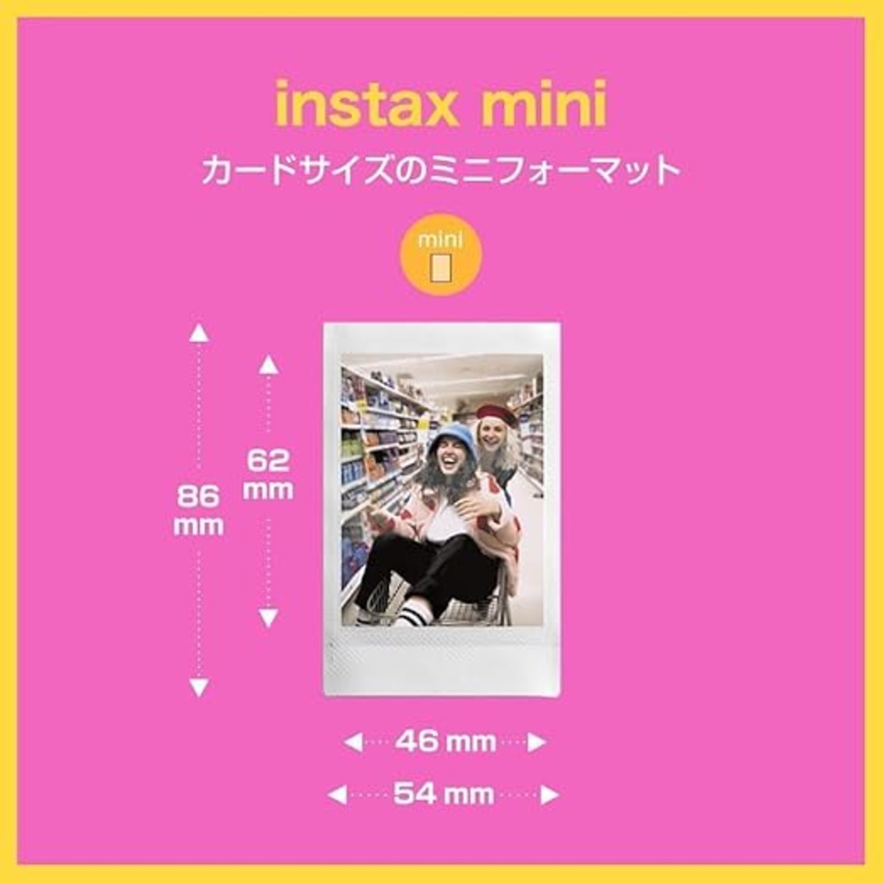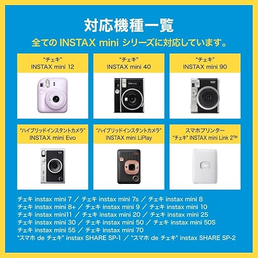 対応機種:“チェキ”INSTAX mini 12 / “チェキ”INSTAX mini 40 / “チェキ”INSTAX mini 90 / “ハイブリッドインスタントカメラ”INSTAX mini Evo / “ハイブリッドインスタントカメラ”INSTAX mini LiPlay / スマホプリンター“チェキ”INSTAX mini Link2