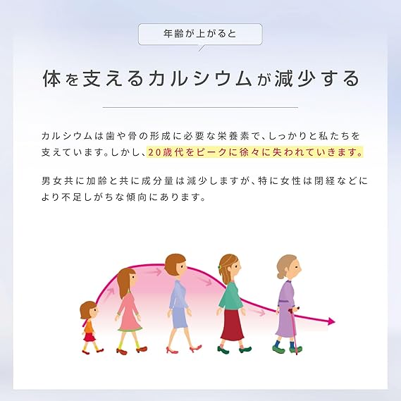 【Point1 カルシウムは、安心な天然ミネラル素材300mg配合。】1日約700mgは摂りたいカルシウム。年齢が上がると腸からのカルシウム吸収がわるくなるので、食事だけでは補いきれません。帆立貝殻由来の天然ミネラルを使用しています。