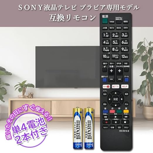 ソニー製ブラビアのテレビに対応し、電源や音量調整、チャンネルや入力切替が可能な互換リモコンです。使用の際必要な電池(単4電池×2本)が付属するのですぐご使用いただけます。