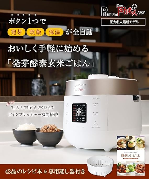 CUCKOO Premium New 圧力名人 SP [公式販売店] 発芽酵素玄米 炊飯器 (玄米4合 白米6合 / マットホワイト) 酵素玄米 発酵玄米 炊飯調理器具 自動調理器 (専用蒸し器 オリジナルレシピ付き) a