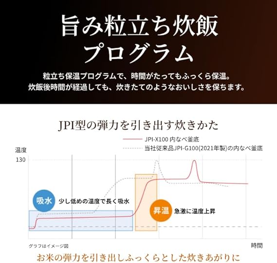 【旨み粒立ち炊飯プログラム】土鍋ごはんの炊き方をお手本に、少し低めの温度で吸水した後、急速に温度を上昇させることで、お米の弾力を引き出し、味わい深いごはんを炊きあげます。