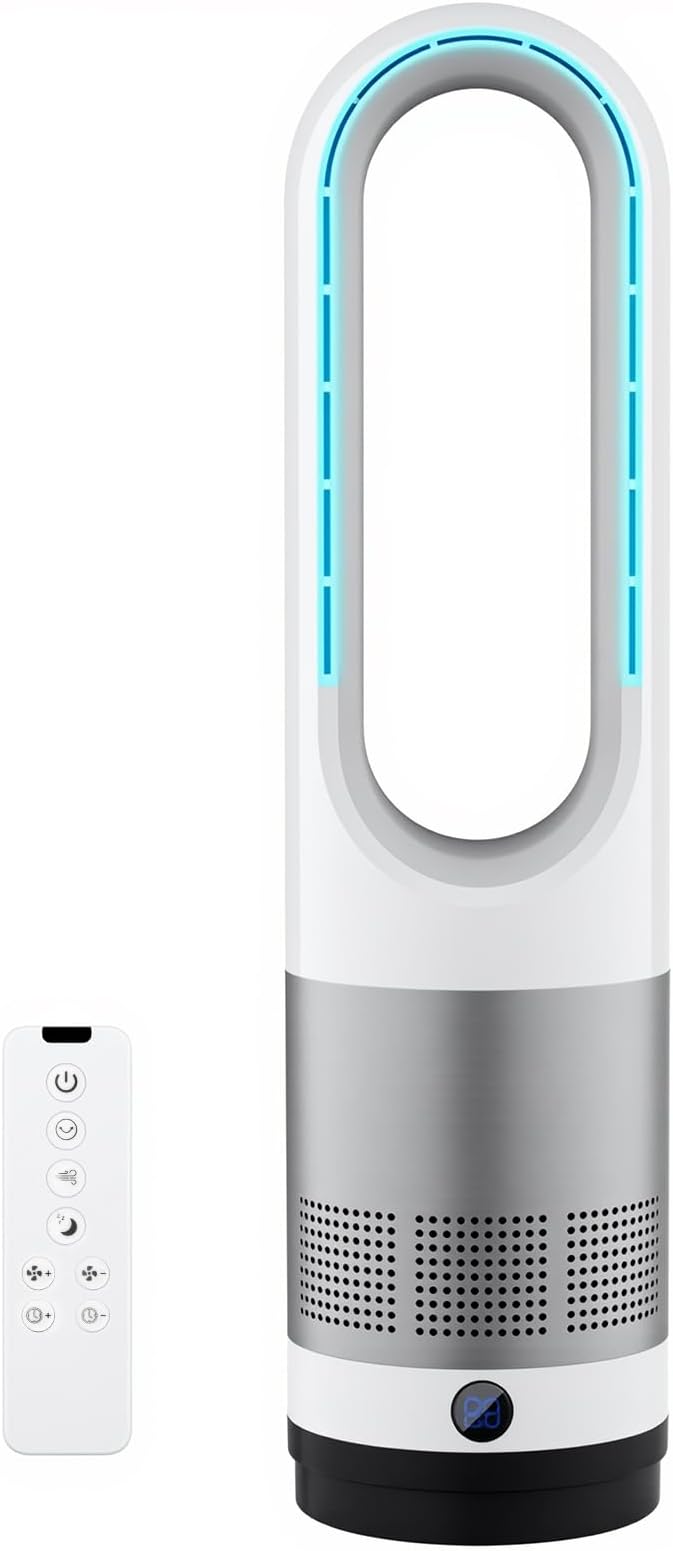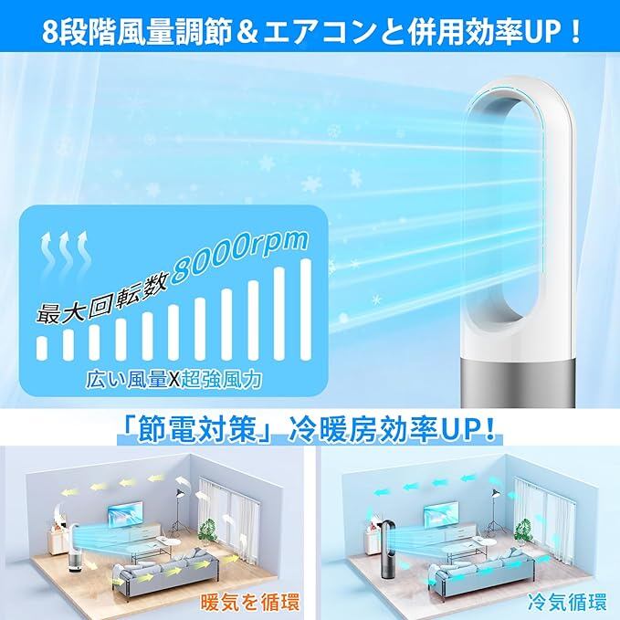 Fyzuf タワーファン 【羽根なし&DCモーター&電気代大幅節約】扇風機 リビング扇風機 サーキュレーター 羽根なし扇風機 DCモーター 静音運転 8段階送風 微風 強風 大風量 100°左右首振り 9H切タイマー 省エネ 節電対策 お手入れ簡単 省スペース 組み立て不要 冷風扇 リモコン付 部屋 リビング 会議室 室内 PSE認証済 日本語説明書 (ホワイト, M) a