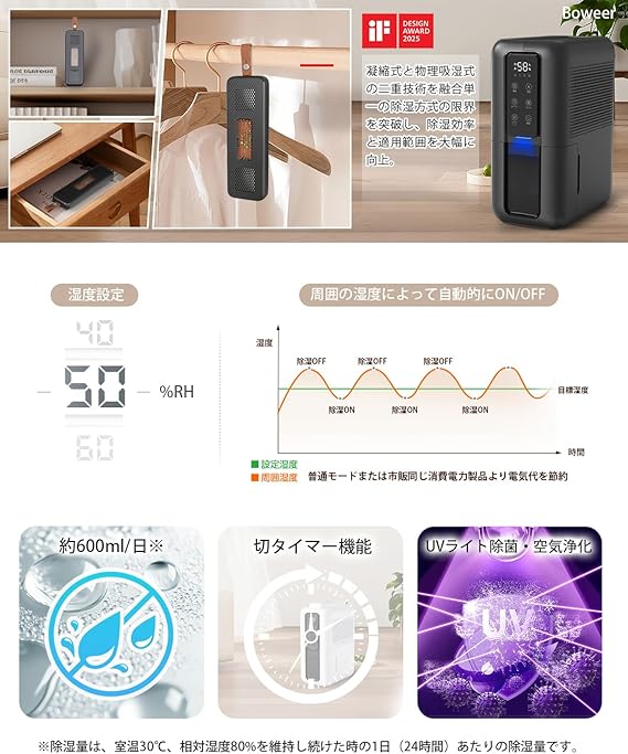 【国際的なデザイン賞「iFデザインアワード2025」】業界初、凝縮式と物理吸湿式の二重技術を融合し、単一の除湿方式の限界を突破し、除湿効率と適用範囲を大幅に向上する。凝縮式除湿機の凝縮除湿効果に加え、物理除湿ボックスを装備しており、除湿機ではカバーしにくいクローゼットやロッカーなどの小型空間に特化した設計です。