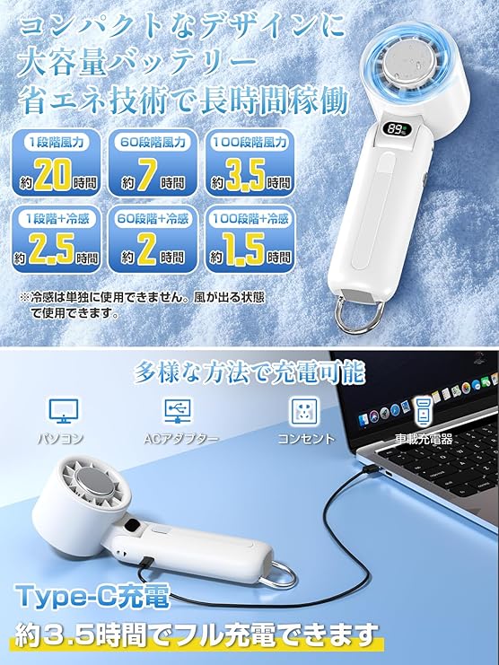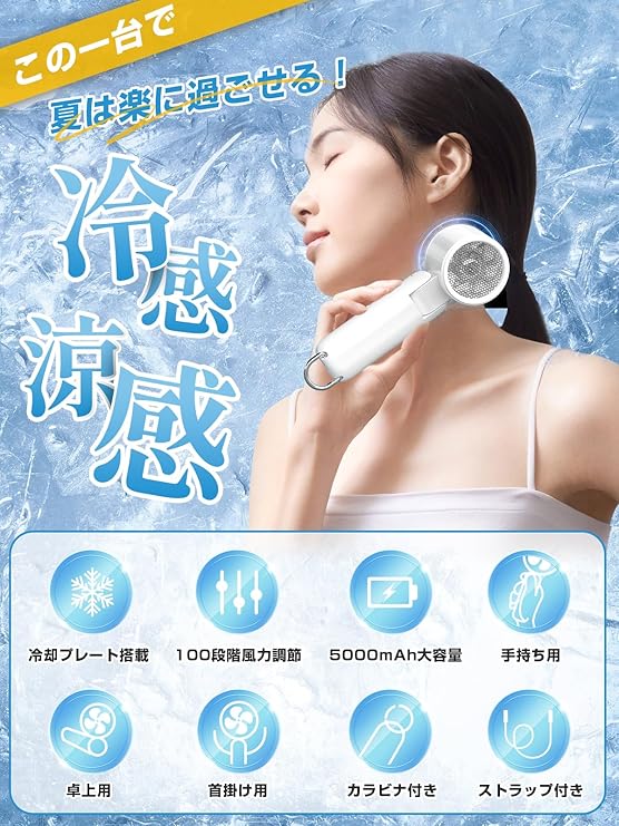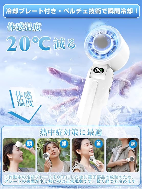 【冷感プレートで冷やす!熱中症対策に最適!】本携帯扇風機に冷却プレートが搭載されていて、炎天下で火照った肌に当てて瞬間に冷却できます。熱中症対策に最適です。製品本体の横の冷感ボタンを長押しすれば冷却プレートがONになります。冷感不要の時はまた長押すればOFFになります。※冷却プレートをOFFにした後に電子部品の放熱のため、プレートの表面が少し熱いのは正常現象です。暫く経つと、もしくはまた冷感をONにしたら熱が消えます。