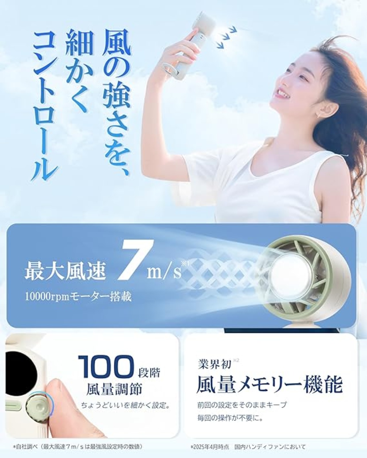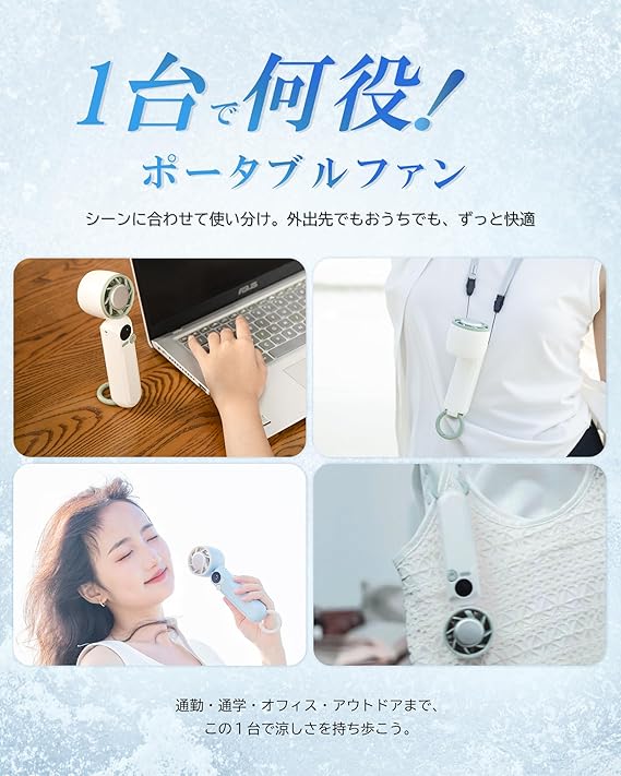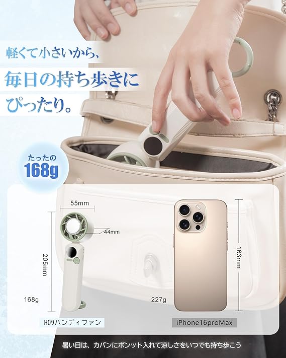 【100段階風量調整&静音設計&メモリー機能】H09ハンディ扇風機は風量はダイヤルをスライドするだけで1〜100段階まで無段階調整可能、やさしい微風から強力な風まで、使用シーンやお好みに合わせて、細かく調整できます。ハンドファンはメモリー機能搭載で、前回の風量設定を自動で再現。毎回の調整の手間がなく、電源を入れるだけで自分好みの快適な風をすぐに体感できます。静音ハンディファンの稼働音は弱モードで約25dB、最強モードで約45db、寝室や図書館、会社など静かな環境でも周囲を気にせず使用できます。