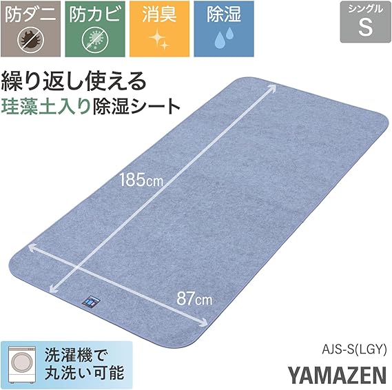 山善(YAMAZEN) 除湿シート シングル 珪藻土入り 洗える 防ダニ 防カビ 消臭 吸湿センサー付き 敷パッド 寝具用 除湿マット 湿気取り 繰り返し使える 梅雨 マットレス ベッド 布団 寝室 ライトグレー AJS-S(LGY) a