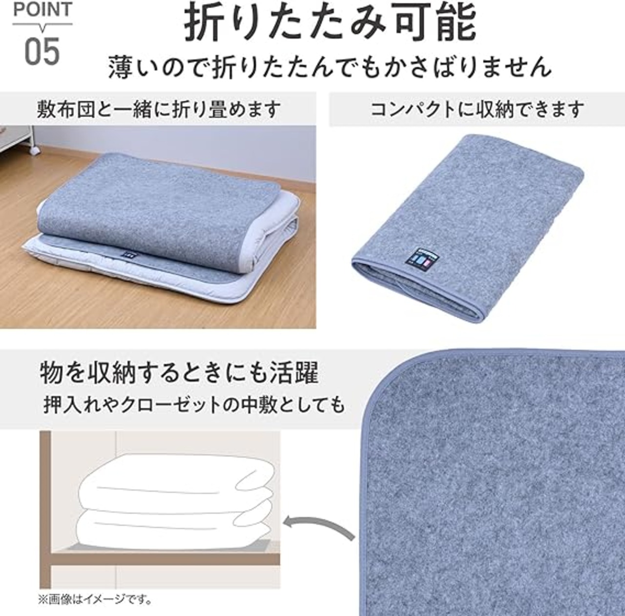 【敷くだけカンタン】お使いの布団やマットレスの下に敷くだけでカンタン、寝汗などの湿気を吸い取ります。押入れやクローゼットの中に敷いて湿気対策にも。