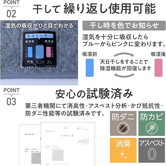 【干し時がひと目でわかる】湿気を十分に吸収したら、吸湿センサーがブルーからピンクに変わるのでひと目で干し時が分かります。天日干しをすることで除湿機能が回復します。
